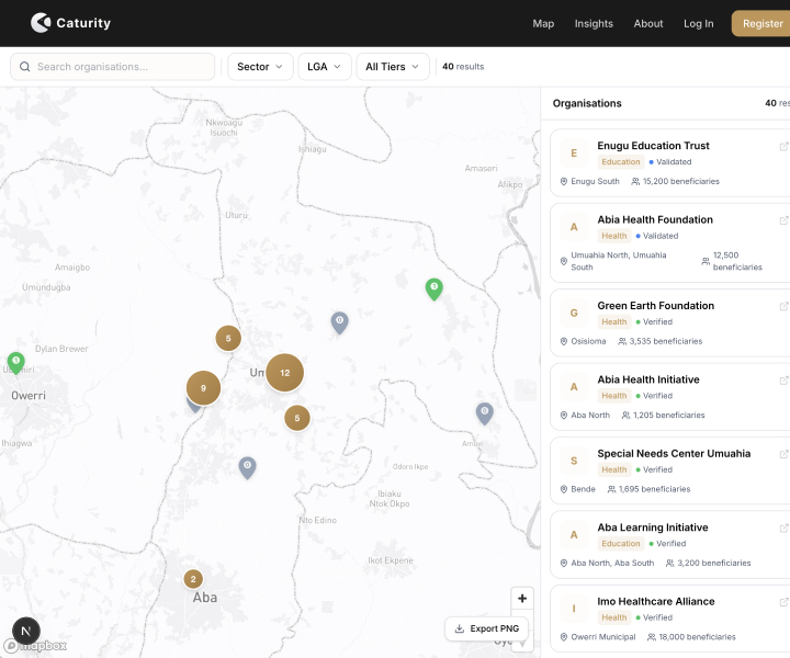 Caturity is a verified registry and intelligence platform for development coordination across Africa. Phase 1 is live in Nigeria. Organisations can register free at caturity.com.